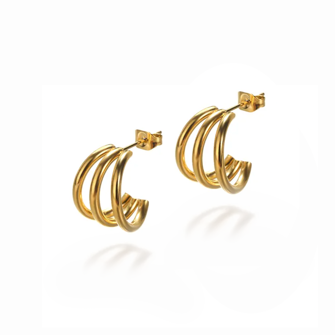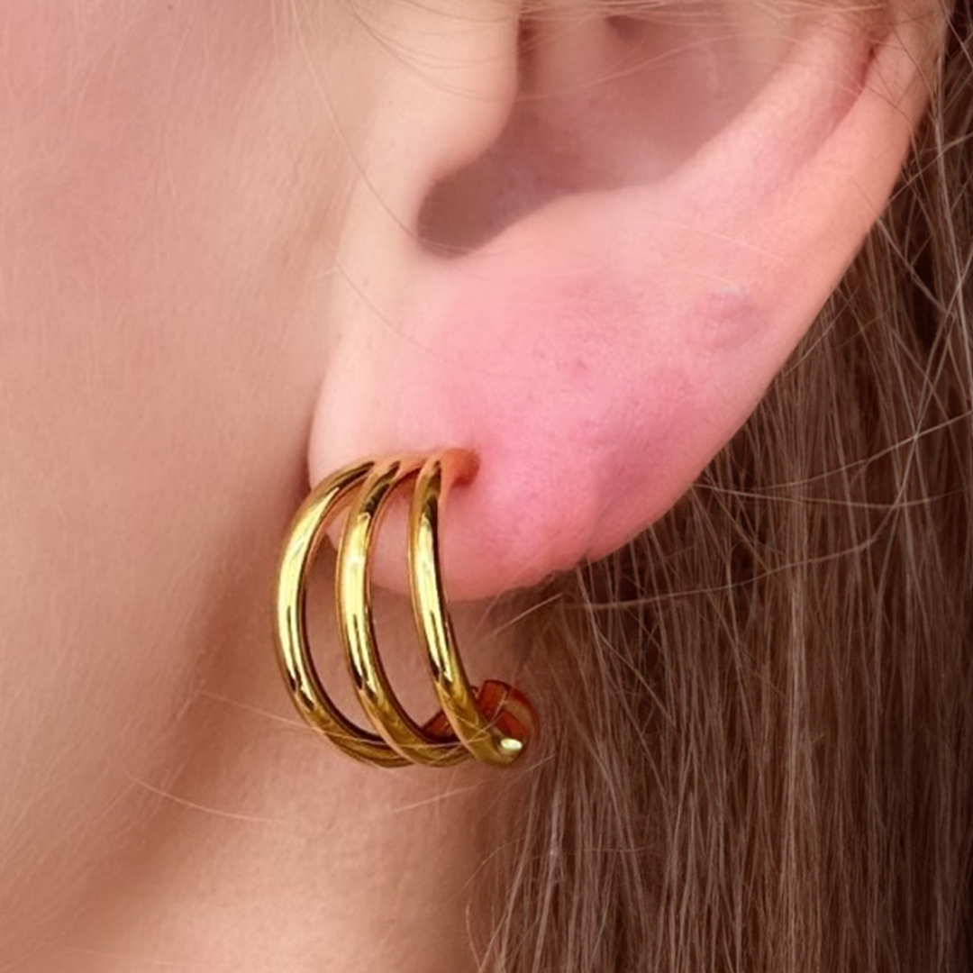 Los Aros Triple son una pieza sofisticada y llamativa, hechos en acero quirúrgico e inoxidable, bañados en oro 18k son resistentes al agua.
