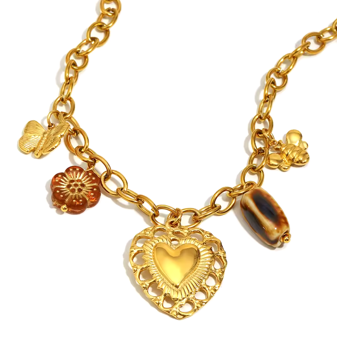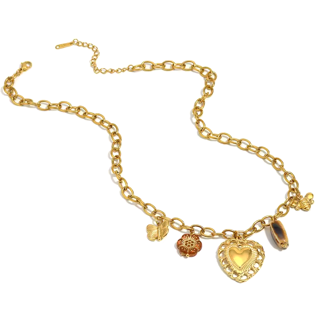 - DETALLES: Colgantes abeja, mariposa, corazón y piedra ámbar